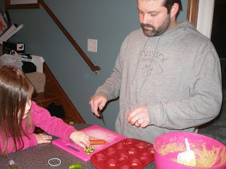 The kids helped me mix up the batter and cut the hot dogs. We filled the muffin tins 1/2 to 2/3 full (should we call them "muffin silicones"?), then added the hot dogs. We tried some full size muffins with a piece of a hot dog (about a 1/3 - whatever fits in your pan), and also some mini muffins with slices of hot dogs mixed in. I preferred the slices in whatever size we made since the "bread to dog ratio" was better. =)