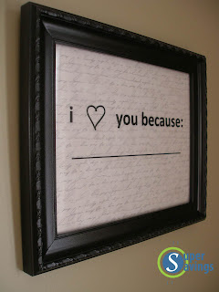 I came across this really cute idea on Pinterest for a picture frame that says "I love you because _______" and you fill in the blank by writing on the glass. It was featured on eighteen25 and I pinned it forever ago thinking I'd make it someday to hang it in our bedroom and leave sweet notes back and forth with the hubzy.....and then Valentine's Day came around and I thought that would be the perfect time to actually do it!